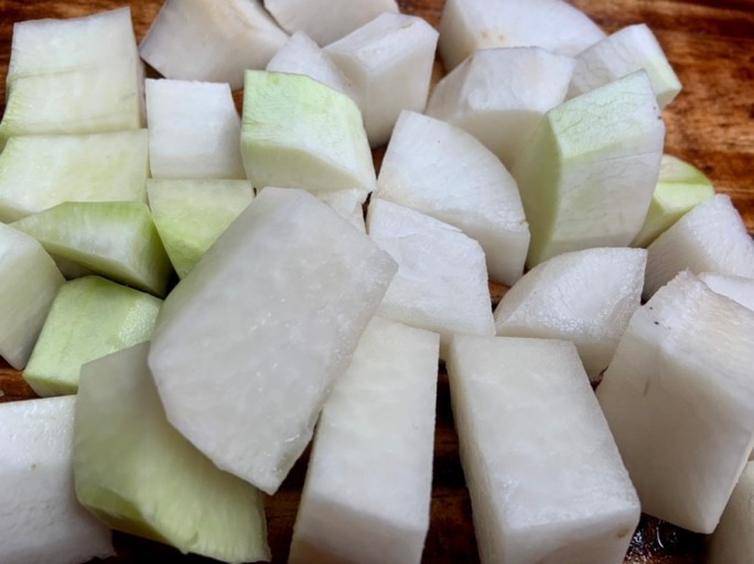 ● 무를 씻어 김치용으로 기호에 맞게 적당한 크기로 썰어 주세요.