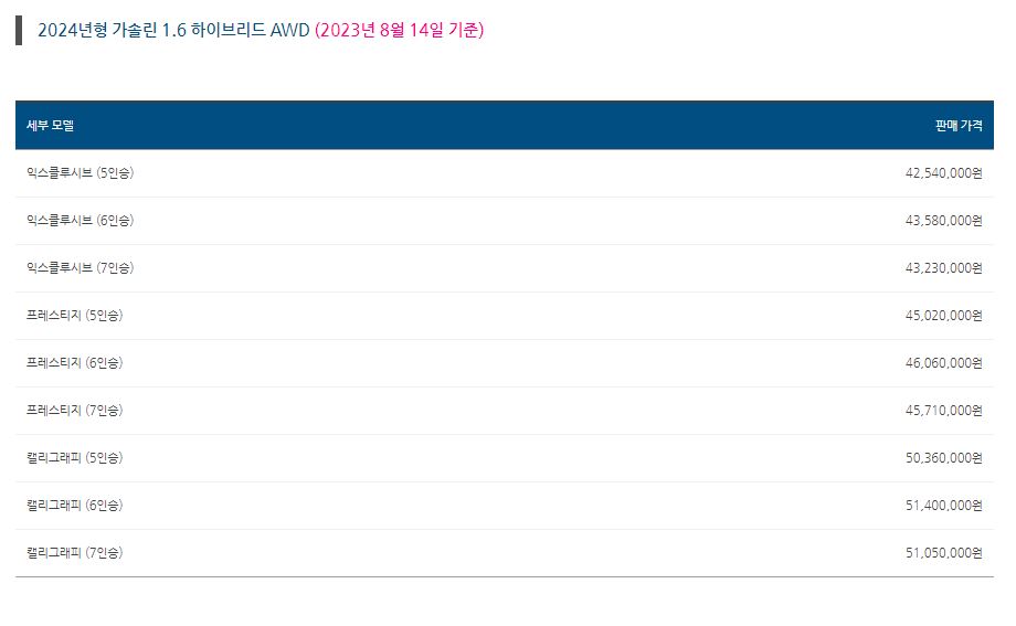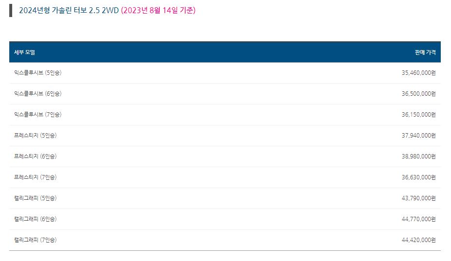 - 가격은 3,546만원 부터 5,140만원으로 다양한 등급으로 구성 (5,6,7인승)