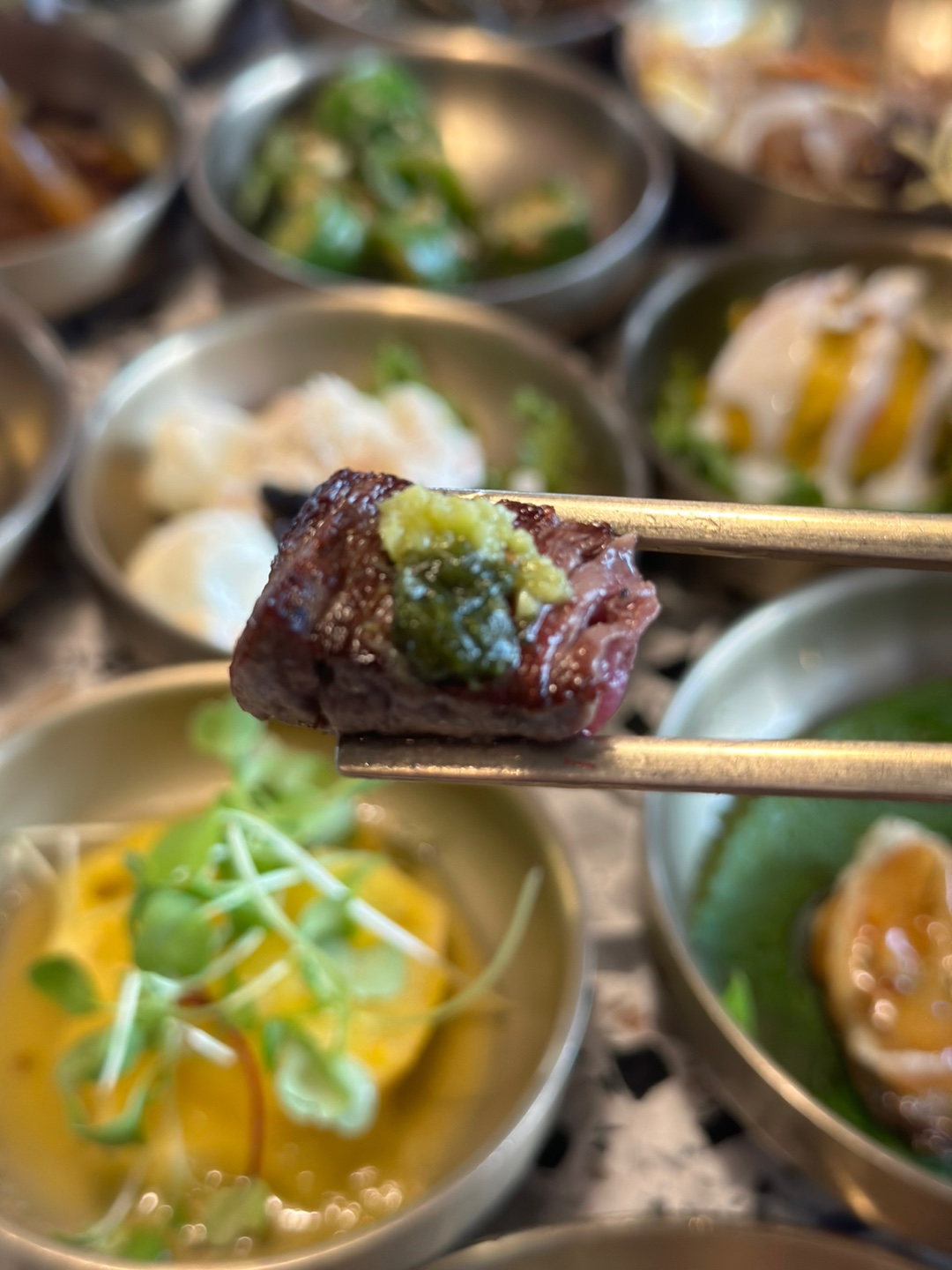 소스는 4종류이며 소금, 곱게 간 명이나물과 고추냉이, 홀그레인 머스터드, 그리고 고기 소스입니다.